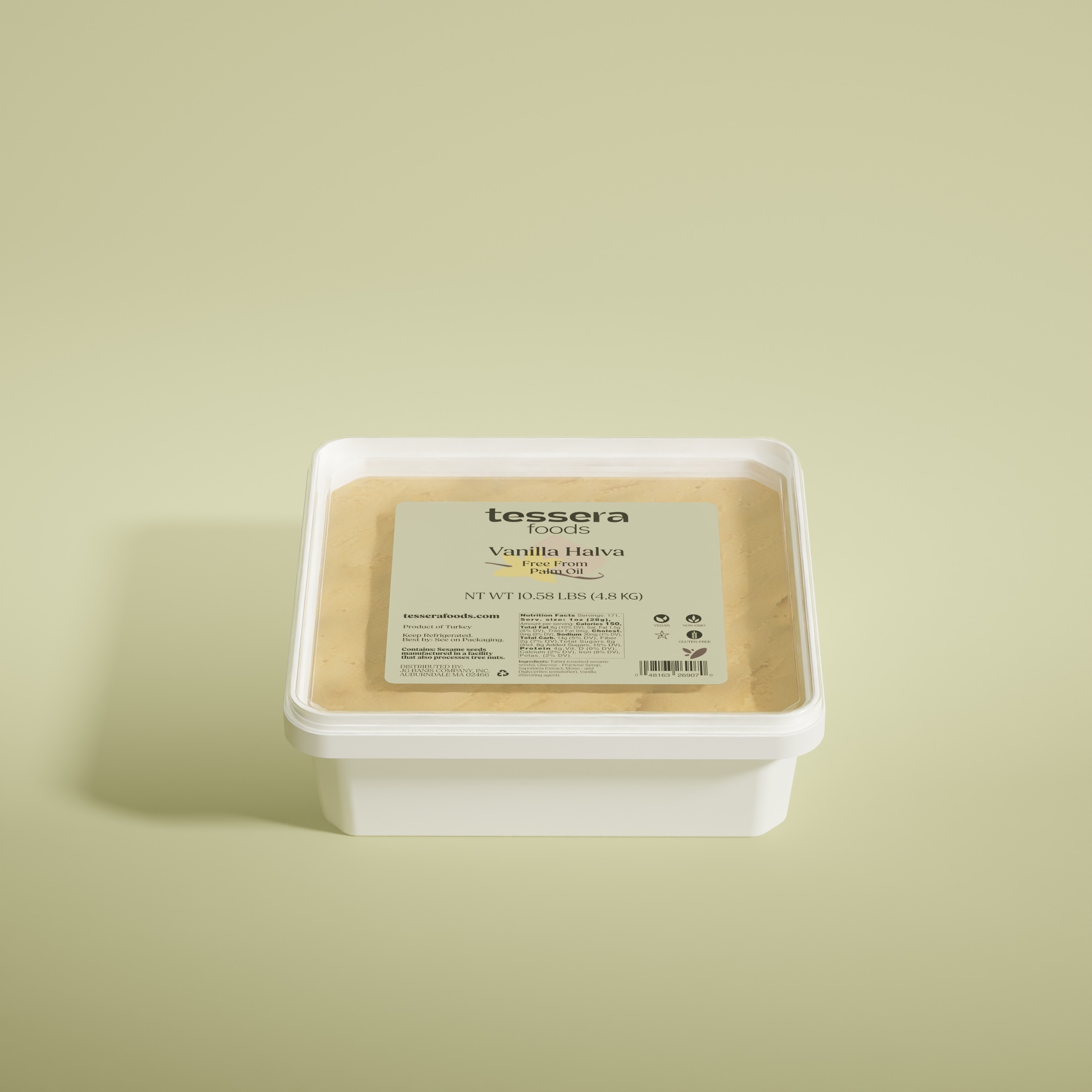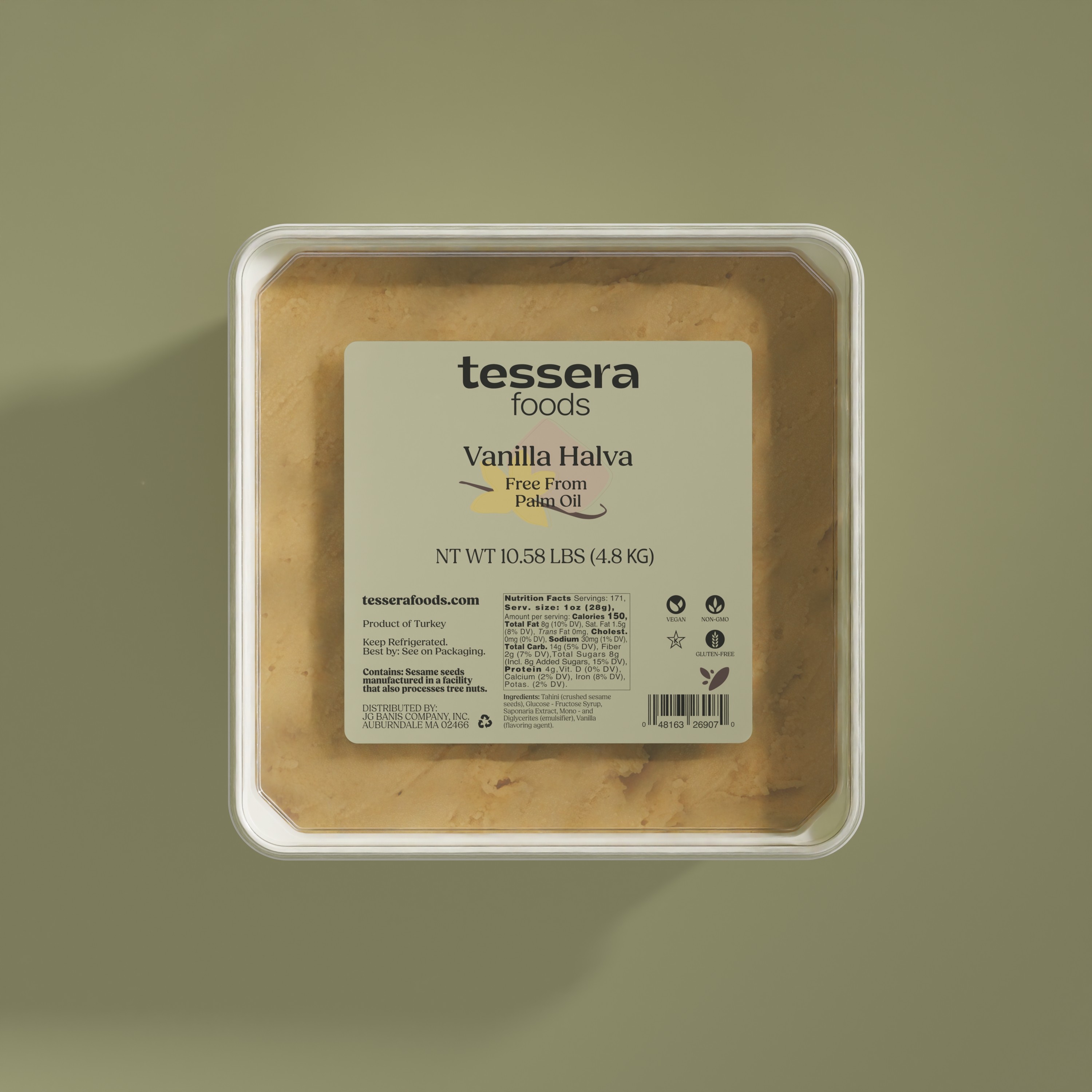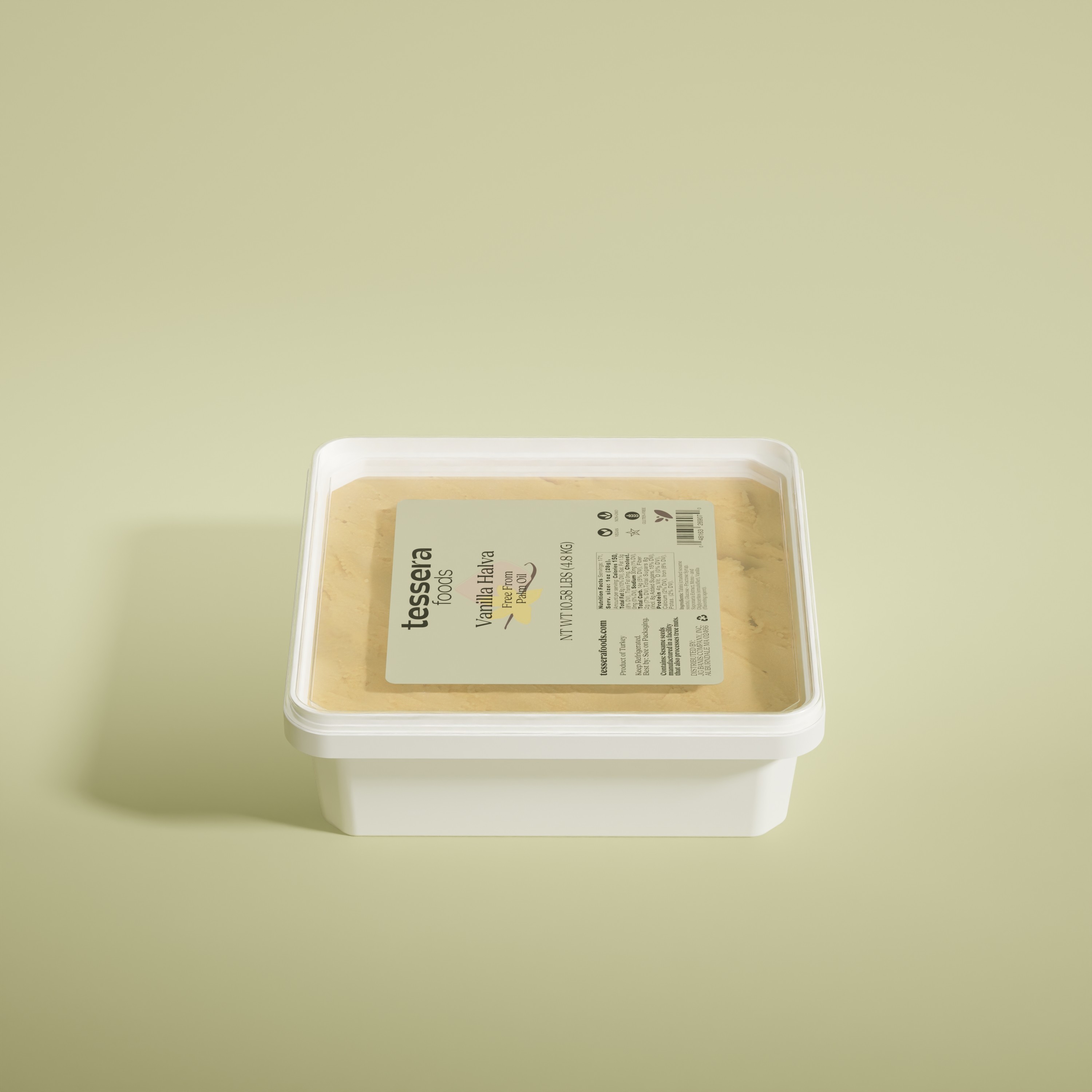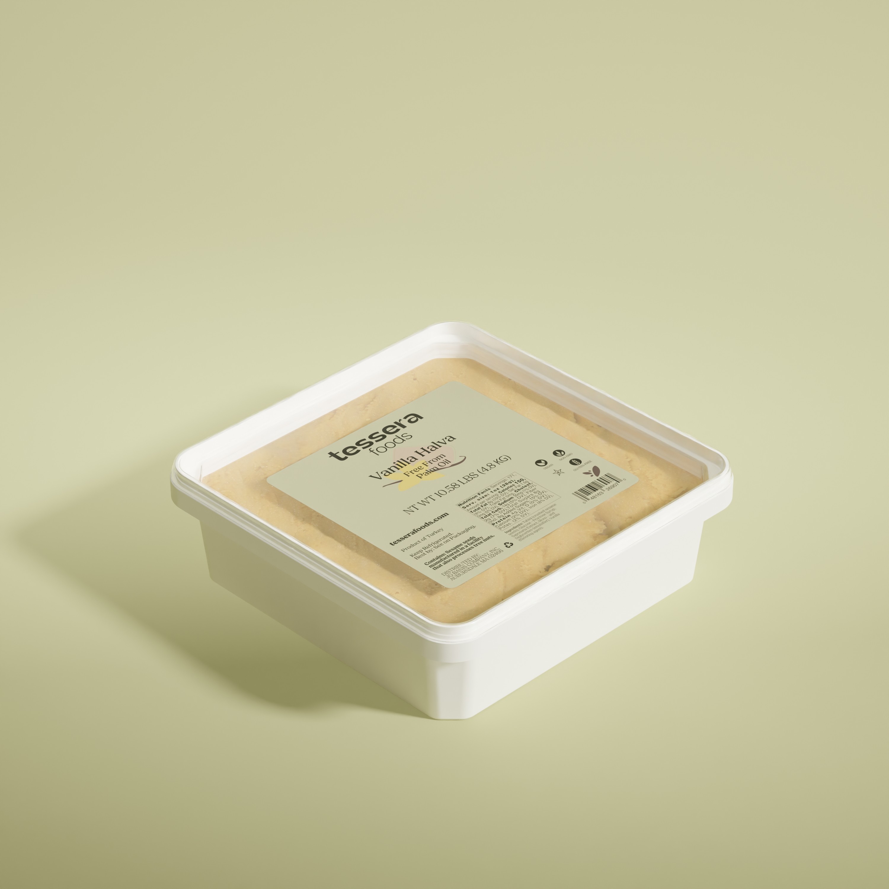 Traditional sesame-based halva with smooth vanilla flavor. Rich, dense, and naturally sweet, this classic Mediterranean confection is ideal for slicing, plating, and dessert applications.